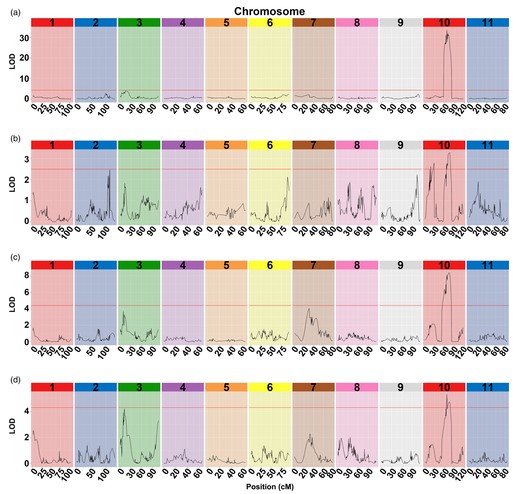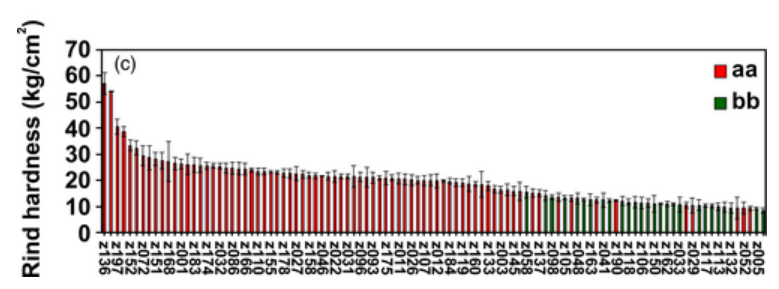 Colocation of rind hardness parameters and cracking‐related traits. (a) RH (rind hardness), (b) CRN (cracking or not), (c) CRW (cracking work), (d) CRT (cracking time).