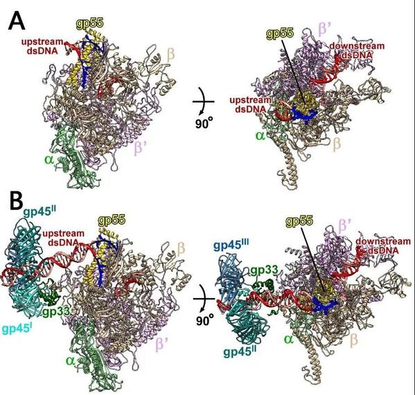For decades, transcription of bacteriophage T4 late genes has served as a model system to investigate mechanisms of transcription regulation. The T4 late promoters consist of a -10-like element placed at the position corresponding to the bacterial promoter -10 element. Nevertheless, there is no sequence conservation at the position corresponding to the bacterial promoter -35 element. In recent years, the research team led by Prof. FENG Yu from the Zhejiang University School of Medicine has conducted a systematic research into the transcription activation of bacteriophage T4 late genes at a molecular level.
