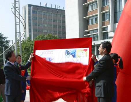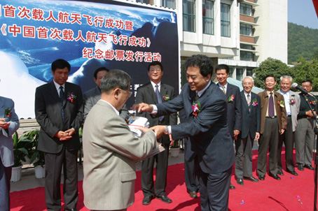 仪式由副校长胡建淼主持。浙江省邮政局邮票局局长陈清在仪式上宣读了国家邮政局《中国首次载人航天飞行成功》纪念邮票发行通告,邮政局负责人吴鼎钧、鞠勇和浙大副校长黄书孟、倪明江分别为邮票和首日封揭幕。省邮政局还向专家们赠送了纪念邮品。