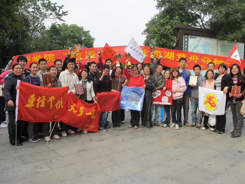 13:30,随着第一声哨响,各支队伍带上地图,擎着队旗,在队长们的带领下从六公园出发,奋勇向前,向苏堤进军。药学院党政机关、各研究所、系、班共39支队,浩浩荡荡,化成一条巨龙,穿梭在风光如画的西子湖畔。选手们你争我赶,体力好的选手不忘拉上体力弱的队友,一同前进,好一派热闹非凡的场面,好一个团结友爱的集体。选手们的激情与友爱赢得了西湖游客们嘉许的眼光。