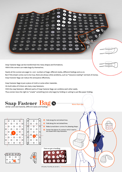 设计说明:Snap Fastener Bags采用大量按扣与材料(布或是其他类型材料)结合的方式,使得用户可以像折纸一样把它进行折叠组合,以形成不同形态不同款式的包——女士们的最爱。当然,如果你愿意的话,它还可以是其他东西而不仅仅是个包。
