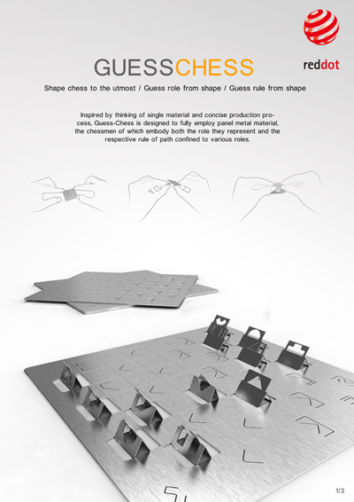 设计说明:Guesschess是一款环保可持续的棋盘设计。通过金属一体成型的工艺手法,集棋盘、棋子于一体,既节省材料、方便生产,又无需包装,在运输中节省空间,实现了产品生产、销售和使用的可持续化。