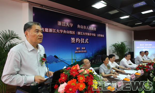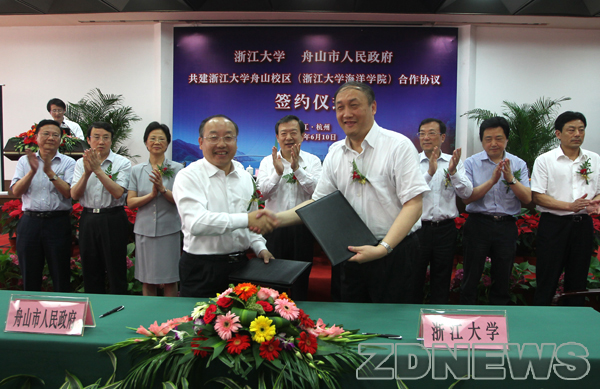 6月10日下午,浙江大学和舟山市政府在杭签订协议,双方将共建以海洋教学与科研为特色的浙江大学舟山校区(浙江大学海洋学院),依托舟山得天独厚的海洋区位优势和舟山群岛新区建设的有利时机,携手打造高水平海洋科教基地和海洋人才高地。省委副书记、省长夏宝龙,省人大常委会副主任、浙江大学党委书记金德水,副省长郑继伟出席签约仪式并讲话。浙江大学校长杨卫与舟山市政府主要负责人代表双方在协议上签字。