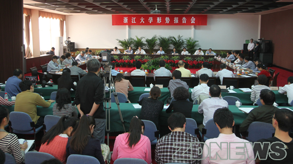 10月26日下午,浙江省委书记赵洪祝来到浙江大学,与浙大师生代表座谈并作形势报告。浙江大学党委书记金德水主持座谈会并作汇报。中国科学院院士、浙大医学部主任段树民,浙大工业技术研究院院长赵荣祥,浙大学生夏江汉、邱实等围绕“科学发展、成就辉煌——迎接党的十八大召开”为主题,结合自身的实际情况在座谈会上发言。