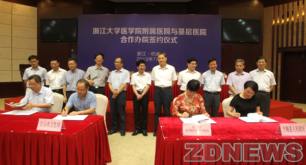 7月9日下午,浙大医学院6家附属医院分别与景宁、龙泉、武义、衢州、常山等浙江省内13个县的县政府签约,与当地14家县级公立医院建立以托管为主要方式的紧密型合作办医关系,实现优质医疗资源下沉,提升县及周边区域医疗卫生服务能力和水平,建设满足当地及其周边区域群众医疗服务的示范性区域医疗中心。