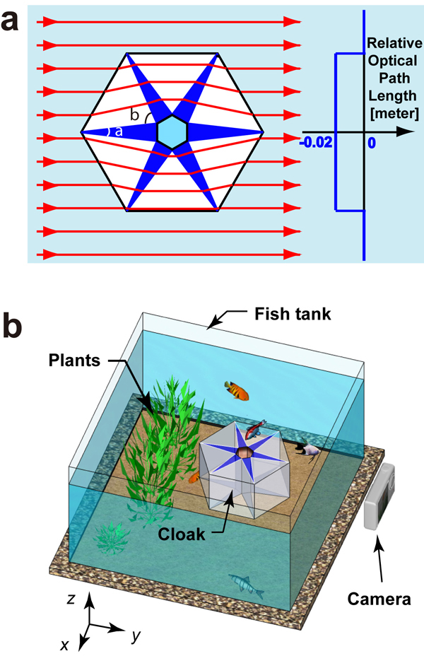 2013年,通过进一步的理论分析,课题组对隐身器件的参数进行优化,并选用在工业上可以大规模制备的一种玻璃作为隐身衣的材料,将隐身衣的“尺寸”扩增到直径分米量级以上,并且可以在任意极化的自然光下隐身。实验显示,一只蹲在六边形隐身装置的小猫,在特定的某个角度,光线可以直接绕过小猫,并回到原来的路径出射。为了探究隐身衣对不同生命环境的适应性,课题组还研发了一组适用于水中隐形的装置:金鱼游进这件“隐身衣”,身后的物体仍然一览无余。“这意味着隐身器件不仅能够隐藏像猫、鱼这样大的物体,生物还能和隐身器件一起活动,隐身效果并不会因此受到影响。”陈红胜说。