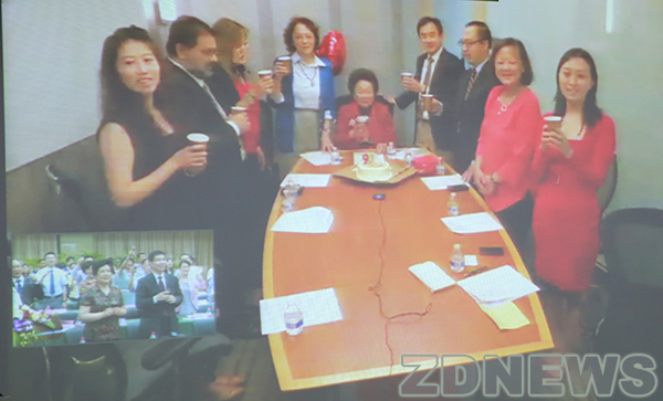 6月23日晚10:00,华盛顿时间上午10:00,浙江大学通过视频连线,遥祝远在大洋彼岸的陈香梅女士90寿辰,并将现场开幕的陈香梅数字馆作为生日贺礼,送给陈香梅女士。在华盛顿会场,陈香梅女士一身红衣、精神矍铄,微笑聆听着这头传递过去的真挚祝福,并对此表示感谢。
