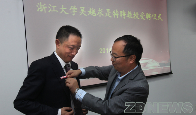 浙大常务副校长宋永华为吴越教授颁发浙大求是特聘教授聘书、佩戴浙大校徽,他代表学校对吴越教授的加盟表示欢迎,期待并相信吴越教授在浙大“天时、地利、人和”的良好环境中,有更多的建树,带动学校建筑学及城市规划学科等的加快建设和发展。
