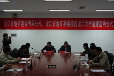 张土乔副校长在致辞中代表学校对各位嘉宾的到来表示欢迎,对此次地矿公司捐资支持建工学院人才培养的义举表示感谢。张校长表示双方的合作必将促进人才与科技、市场与实践的深度融合,更好地服务于经济社会发展。浙江省国土资源厅副厅长、浙江省地质勘查局局长林天宁到会并作了重要讲话。林厅长在讲话中对地矿公司的捐助行为表示了肯定,同时希望校企双方在人才培养、科学研究和社会服务等方面建立起更加紧密的合作关系,实现“双赢”。随后,张校长代表学校与浙江省地矿建设有限公司签署了捐赠协议,学校发展联络办副主任、教育基金会副秘书长党颖接受了捐赠,地矿集团的捐赠资金将主要用于设立“浙江地矿奖助学金”,支持学生教育教学实践和科技创新活动等,从而培养学生的创新精神和实践能力,满足社会和企业对人才的需求。建工学院党委书记陈雪芳向捐赠单位颁发了捐赠证书。浙江大学发展联络办、建工学院负责人及企业和师生代表共同见证了本次捐赠仪式。
