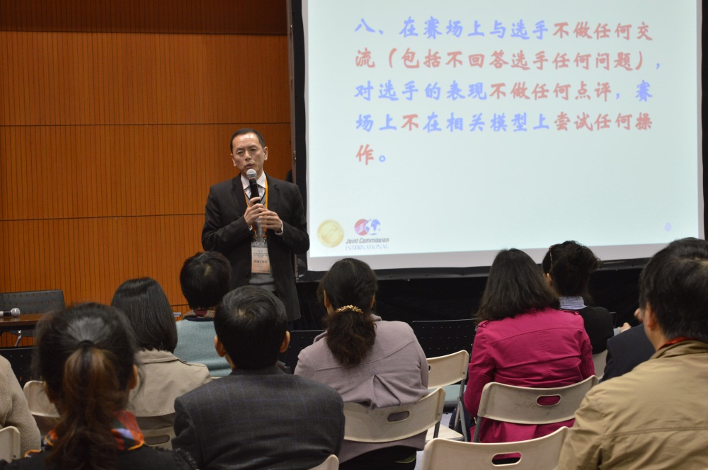 对于一个合格医生的评价主要是从几个方面来评价:快速的判断能力,合理的思维能力,精准的决策能力,这个都是做医生必不可少的基本素质,那为了促进我们国家的医学教学的规范化,教育部举办了临床技能竞赛,主要的目的是想推动我们国内临床教学的规范化,使得更多的医学生在毕业的时候能够具备为老百姓服务的基本能力。因此作为这次赛事的主办方,我们在命题方面主要的思路就是要评价每个学校的医学教学,每个选手他的基本技能掌握的程度方面来讲有三个方面的基本原则:一、客观,能够客观的反应学校的教学水平和选手掌握临床技能的情况,二、全面,全面的反应一个选手的综合素质,三、公平。因此在这个原则的指导下。我们把赛事分为三个阶段:初赛阶段,半决赛阶段和决赛阶段。所以我们队初赛的题目就是选择了作为一个医学生应该掌握的最基本的技能。用20个技能加试题来反应一支队伍三位选手的临床技能和基本知识掌握的情况,然后在半决赛阶段,就需要医学生有非常快的反应能力,判断能力,赛题会要求学生内外结合,妇科儿科结合以及在外科的操作当中要做到很标准,最后的结果要符合我们医疗质量的基本标准。最后总决赛的题目要求我们一个队伍有协同能力并且具备作为一个医生应该有的法律知识和医患沟通能力,在一个新发突发传染病危重病人的诊治过程当中,怎么样充分体现医生个人的综合素质和一个团队的协作精神,这样的话能全面评价我们的医学教学和选手的素质。