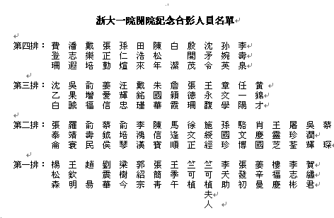 王开明教授回忆当年建院开业典礼的情景,仿佛就在眼前,她说,虽然那时她还是一个七、八岁的小姑娘,但跟随父亲几乎天天在医院里,耳闻目睹了父亲筹建医学院和附属医院的操劳和工作情况,还跟医护人员们“混”得很熟。虽然时隔久远,她看着照片上的每一位附属一院的“创始人”,记忆犹新,除了有三、四位报不出姓名外,其余的她都能一一报上姓名,还能说出他(她)是干什么工作的。说到这帧照片的拍摄时间和具体地点,王开明教授这样回忆:开幕典礼是11月1日下午举行的,当时天气晴朗,秋高气爽,田家园包括头发巷非常热闹。我们从当时的报道中看到是这样描述的:“本校师生及来宾前往参观者,极为拥挤,头发巷上,途为之塞。”可见当时热闹拥挤的情景。王开明教授说,医院开幕典礼是由竺可桢校长亲自主持的。当时的《东南日报》上说:“蒙党政长官、医界先进暨各界领袖宠赐隆仪莅临参观指导,不胜荣幸。”我们可以推断,浙大医院的建成开院不仅是国立浙江大学的一件大喜事,也是时任当地党政长官、医学界和社会各界支持和拥戴的一件大事。这张珍贵合影是在开幕典礼结束后,在田家园六号的一幢二层楼房前拍摄的,这幢楼一层是手术室,二层是妇产科和眼科病房。这帧照片让我们倍感敬仰和羡慕的是每个人的精神状态和仪容仪表,他们个个神采奕奕、服装崭新整洁、发型时髦,尤其吸引眼球的是中间右侧的竺可桢校长与夫人和中间左侧的王季午院长与夫人,在一片洁白的工作服的映衬下,深沉、庄重而漂亮,成为这帧照片的重心,仿佛是精心设计的画面。由此给人的遐想是浙大附属第一医院的开端就是那么的气度不凡,将来必定宏图大展。