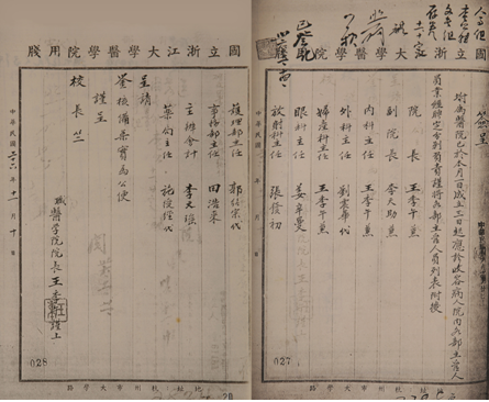 这是我们迄今发现最早的医院“各部主管人员业经聘定”后,由医学院谨呈国立浙江大学校长竺可桢的“上行文件”,相当于现在的医学院将附属医院“院级及中层领导干部任命文件”上报浙江大学备案。从这份“干部任命文件”上,我们可以看到几项重要信息:首先,成文时间是中华民国三十六年十一月十日,即公元 1947年11月10日,为浙大医院成立后的第十天。开头写明“附属医院已于本月1日成立,3日起应诊收容病人”。明确记载医院成立是11月1日,正式开 诊和收病人是3日。其次,医院的机构设置、院级领导和中层干部队伍非常精干,其中,王季午先生“身兼四职”,既是医学院院长,并兼任浙大医院院长,又兼任医院内科主任和妇产科主任,可以想象王季午院长的工作有何等繁忙。其三,名单后面写上“呈请:鉴核备案、实为公便。谨呈:校长竺。职:医学院院长王季午谨 上。”并盖有“王季午”私章。由此可见,行文的格式非常的严谨和完备。虽然“职”字是民国时期下级给上级行文时常用的称谓,但在这里我们可以领会到,作为浙大医学院、附属医院院长的王季午先生是非常的平和而谦逊,他对浙大校长竺可桢先生是非常尊敬的。