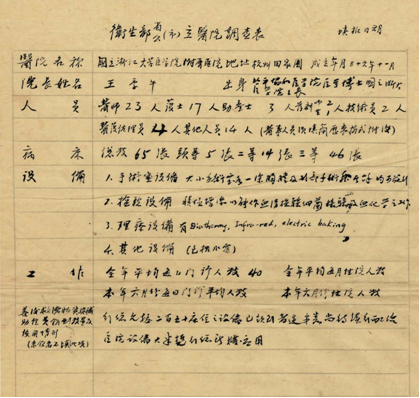这张“卫生部省公(市)立医院调查表”,遗憾的是没有填写“填报日期”,所以它确切的生成时间我们无从知晓。也可能这是自留的一份草稿,正表已经上报。但从我们所查找的建院初期的资料以及报表上的一些统计数据分析,可以推断出这张报表的时间应该在1947年的年底或1948年的年初。它是我们收集整理院史材料中发现的最早的一张“院情调查表”,为我们提供了浙大附属第一医院建院之初的规模、人员、技术力量、设施等数据,因此具有珍贵的史料价值。