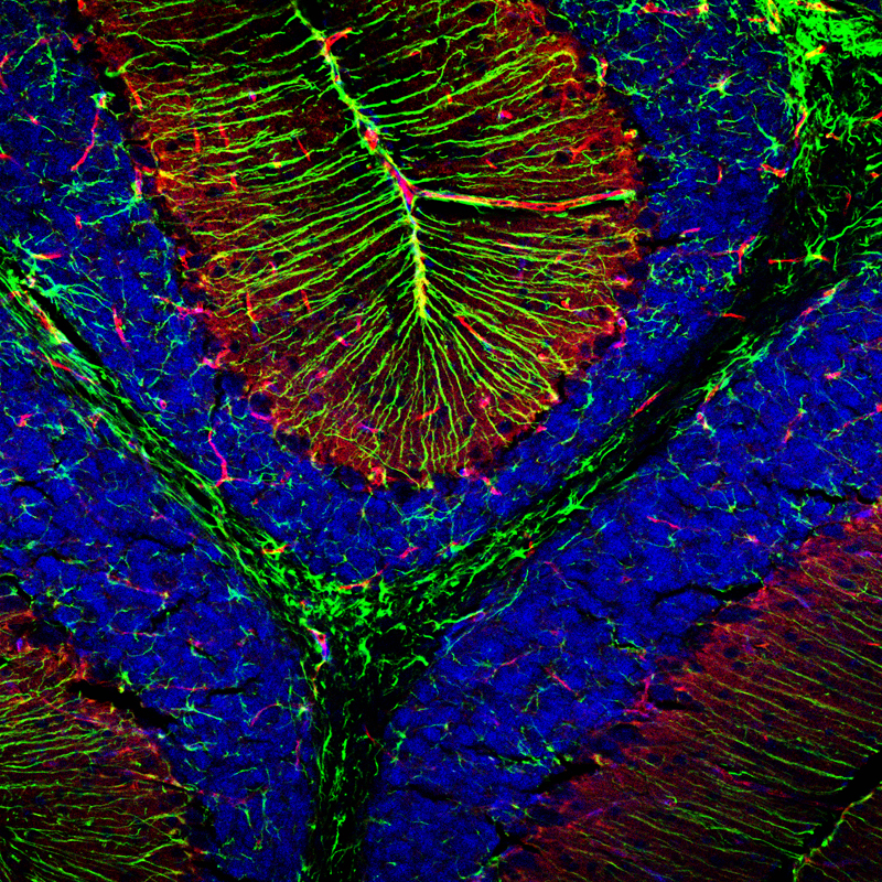 这幅作品取材于小脑组织切片,矢状切面的胶质细胞染色,两类细胞形态即有个性,又有共性,整体上像是一双圣手捧起了星芒。由作者使用医学院公共技术平台仪器——奥林巴斯正置双光子共聚焦显微镜拍摄而成。专家点评:图像很美,准确反映了小脑中不同蛋白的分布特点;层次分明,信号清晰细腻。能够在100多幅作品中脱颖而出,实至名归。
