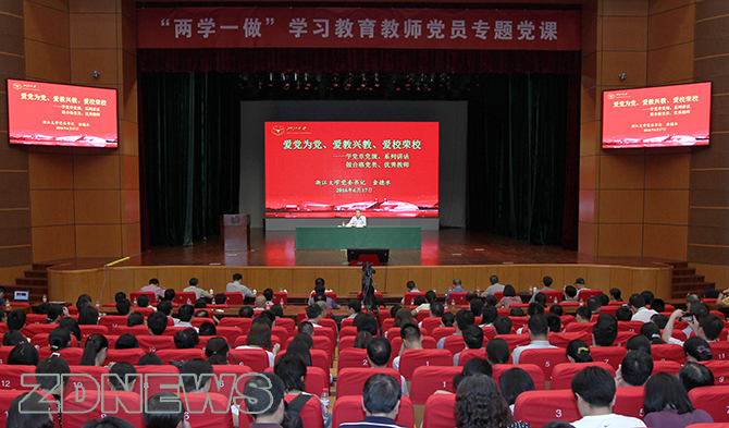 6月17日下午,浙大举行“两学一做“学习教育教师党员专题党课。校党委书记金德水面向全体教师党员提出要“爱党为党、爱教兴教、爱校荣校”,以“两学一做”为动力,更加全面地融入时代、融入国家、融入学校,争做合格党员、优秀教师。