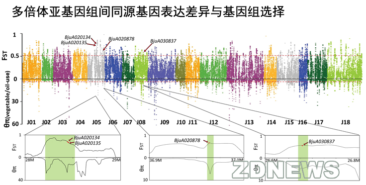 论文第一作者杨景华副教授介绍,多倍化是植物进化中的普遍现象。半个世纪以来,众多学者以小麦、棉花、油菜等为模式作物,对复杂基因组组装和同源基因表达进行了广泛研究,但尚未揭示多倍体物种中同源基因表达与选择的机制。这种机制,终于通过我国的“乡土”作物榨菜得到了揭示:异源多倍体芥菜亚基因组间呈非对称进化,亚基因组间同源基因中具有显著表达差异的基因表现出更快的进化速率,这些基因在菜用和油用芥菜分化中受到选择。