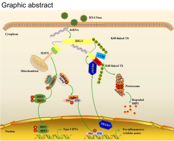 机体在遭遇病原微生物感染后,天然免疫细胞通过模式识别受体,识别病原微生物中一系列保守的病原分子模式,触发迅速的天然免疫反应抵抗病原微生物的入侵。RIG-I能够识别病毒中的dsRNA,活化RIG-I信号通路,促使I型干扰素的产生。前期课题组发现,在感染RSV病毒的病人外周血单核细胞中FBXW7显著降低,这预示着FBXW7在病毒感染过程中具有重要的作用。随后,在髓系细胞中特异性敲除FBXW7基因的小鼠VSV病毒和H1N1病毒感染更加敏感,VSV和H1N1病毒复制更加活跃,I型干扰素的产生显著降低。进一步的研究发现,在病毒感染过程中FBXW7能够结合并降解SHP2,从而抑制SHP2/C-CBL复合物对RIG-I的降解。该研究揭示了FBXW7在抗病毒天然免疫中发挥着重要的调控功能,可为深入认识天然免疫的调节机制提供新的观点并可能为治疗感染性疾病提供新的思路和理论依据。