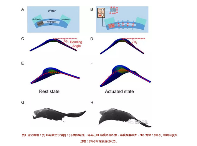 该软体机器鱼(总重量90g,身长9.3cm)从海洋生物鳐鱼(蝠鲼)的柔软身体与柔性扑翼推进获得启发,利用介电高弹体薄膜作为软体人工肌肉驱动器。介电高弹体是一种典型的电响应聚合物,在外加电场下作用下,介电高弹聚合物可以产生大变形,具有高弹性能密度、短反应时间、高效率等优点。当在介电弹性体上施加薄膜厚度方向的电压时,介电高弹聚合物薄膜会减小厚度,扩大面积。该软体机器鱼是通过介电高弹体薄膜对交流电压的响应,将薄膜张力变化转化为机器鱼的扑动,从而通过柔性鳍获得水动力。