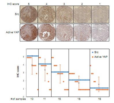 本研究发现了Hippo通路关键激酶Lats1受酪氨酸磷酸化调控的新机制。在细胞黏着条件下,Src被激活并在多个位点上直接磷酸化Lats1。细胞培养和小鼠皮下移植瘤研究模型表明Src抑制Lats1的抑癌作用,并且YAP对Src诱导的肿瘤发生起重要作用。通过癌症组织芯片的免疫组织化学染色发现在人乳腺癌中Src的蛋白水平和去磷酸化的活化YAP的积累呈正相关关系。这些发现揭示了Src对Lats1的酪氨酸磷酸化是细胞黏着调控Hippo信号通路的新机制,并提示Src的激活对于肿瘤发生中YAP的失调可能起重要作用,为进一步阐明Hippo信号通路在癌症中失调的机制和开发靶向治疗方案提供了新的思路。