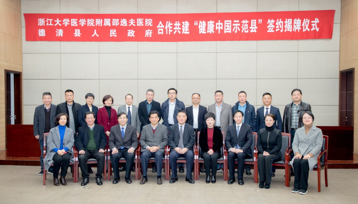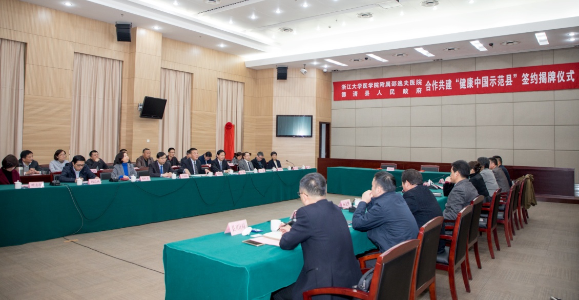 今天上午,浙江大学医学院附属邵逸夫医院与德清县人民政府合作共建“健康中国示范县”签约揭牌仪式在德清县行政中心举行。德清县委副书记、县长王琴英,县政协主席张林华,县委常委、组织部部长罗芳,县人大副主任杨文华,副县长洪延艳,县委组织员陈景芳等德清县领导出席签约揭牌仪式。邵逸夫医院党委书记、副院长刘利民,党委副书记李强,党委副书记丁国庆,总会计师罗红芬,下沙院区副院长翁晓川、周道扬、虞洪,下沙院区党委副书记叶志弘,邵逸夫医院派驻德清院区常务副院长黄翯等出席仪式。德清县政府办、县人才办、县编委办、县委宣传部、县发改委、县民政局、县财政局、县人力社保局、县市场监管局的主要负责人,以及县卫计局全体班子成员,和县医疗卫生单位部分主要负责人共同见证这一历史时刻。