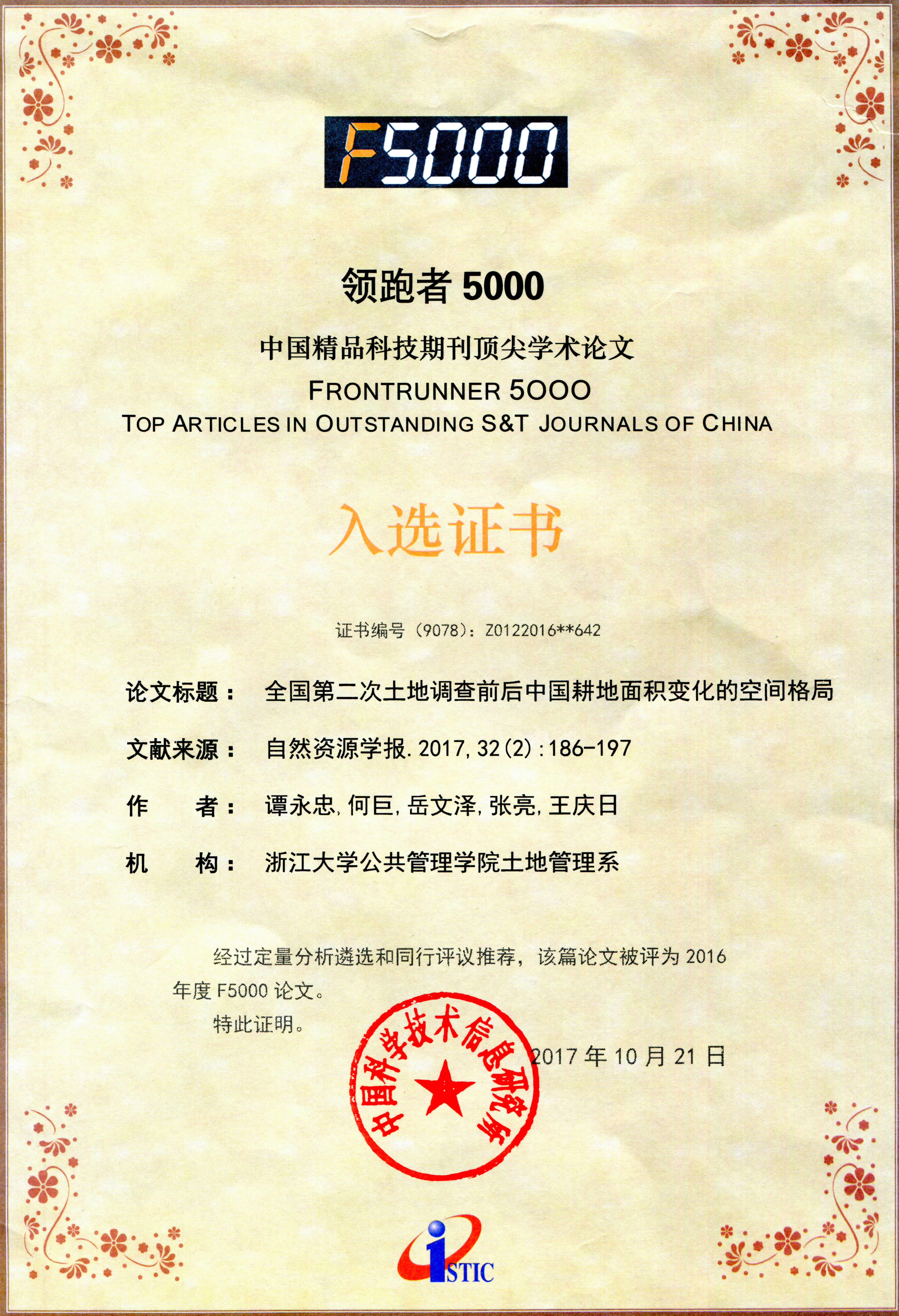 日前,由我院谭永忠副教授等人合作撰写的论文《全国第二次土地调查前后中国耕地面积变化的空间格局》,入选了中国科学技术信息研究所的2016年度中国精品科技期刊顶尖学术论文,即F5000。F5000是中信所为了促进中文科技期刊进入国际重要检索系统,将中国优秀论文推向国际学术界而设立的奖项。入选F5000的文章可以视为该年度具有较高影响力的论文。