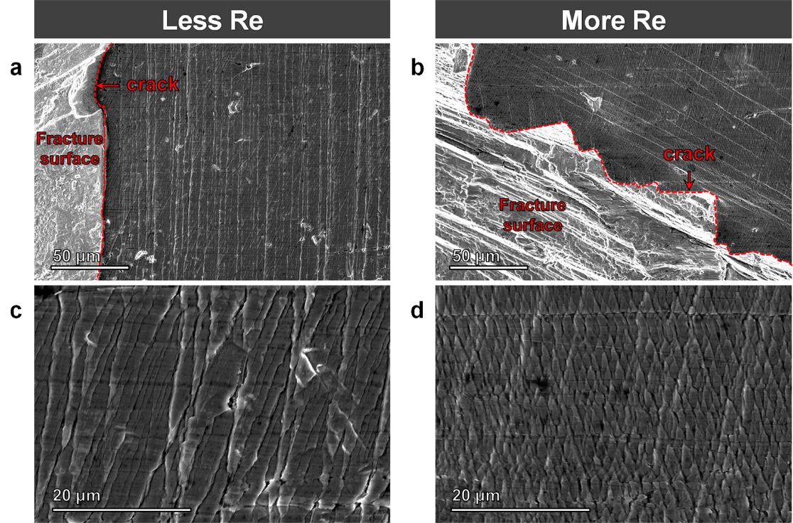 相界面位错网含Re量不同的样品A(左列)和样品C(右列)在750°C沿[001]方向拉伸断裂后的SEM图。 (a, b) 样品A和C断裂后的裂纹。(c, d) 样品A和C表面的滑移带