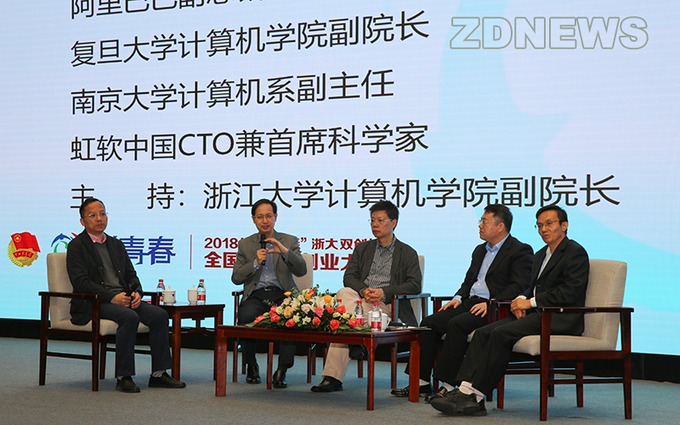 主题交流环节中,阿里巴巴副总裁华先胜,复旦大学计算机学院副院长薛向阳,南京大学计算机系副主任高阳,浙江大学计算机科学与技术学院副院长吴飞以及虹软中国CTO兼首席科学家王进上台交流,就人工智能领域技术前沿、创新创业教育的理想与目标等话题展开学术交流与讨论。随后,三位青年创客代表发言交流,讲述自己的创业故事,分享创业经验,展示青年学子的创新创业风采。