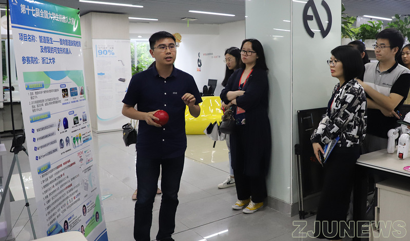 6月13日,第五届中国“互联网+”大学生创新创业大赛新闻发布会召开,当天下午,来自《人民日报》《光明日报》、中央人民广播电台、中国教育电视台、新华网等中央和地方的主要媒体记者一行人,对浙江大学双创教育与实践成果进行了现场调研。