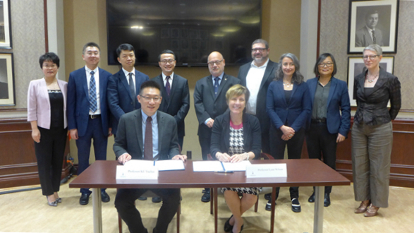 6月21日,两校代表共同见证了重要协议的签署。医学院副院长柯越海教授和多大医学院副院长Lynn Wilson教授(兼任该校协理副教务长)分别代表两校医学院签署了“医+X”交叉学位项目合作协议,旨在携手推进新医科复合型交叉人才的创新培养模式。此前,两校聚焦医学领域,签署了博士研究生联合培养学位项目协议。在学校“一流学科伙伴提升计划”的支持下,从遗传学到神经科学,从教授互聘到博士生联合培养,两校医学合作不断向深度与广度拓展。下午,心理与行为科学系主任何贵兵教授与多大安大略教育研究院院长Glen Jones教授共同签署了院际合作谅解备忘录,双方计划在师生交流的基础上推动人才培养、科学研究全方位、多层次的合作。