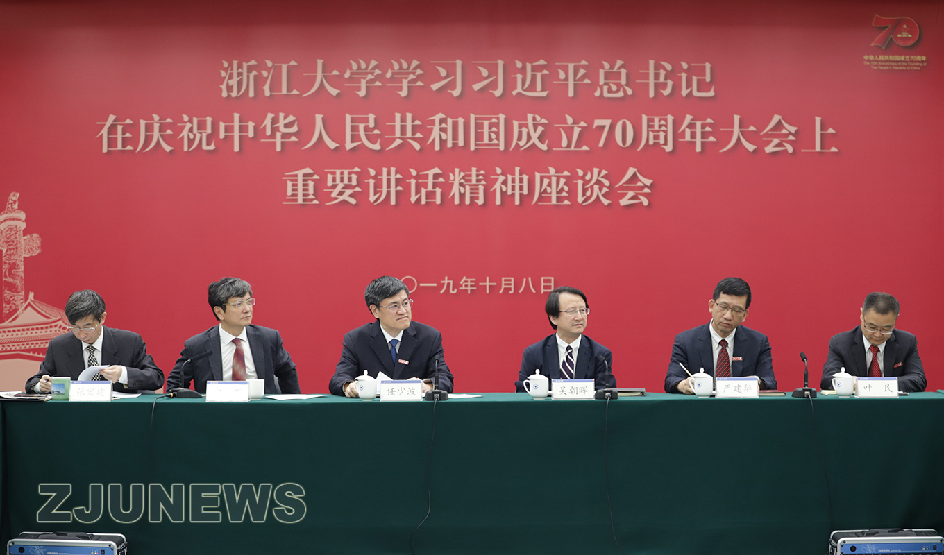 10月8日上午,浙江大学学习贯彻习近平总书记在庆祝中华人民共和国成立70周年大会上重要讲话精神座谈会在紫金港校区召开。会议指出,要深入学习贯彻习近平总书记重要讲话精神,不忘初心、牢记使命,将爱国情、报国志、强国行高度统一起来,为加快建成中国特色世界一流大学、建设社会主义现代化强国而努力奋斗。