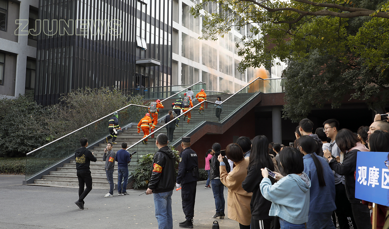 “太刺激了!”11月8日,在全国消防日的前一天,浙江大学紫金港校区医学院科研楼A座前,不少师生踮着脚、探着头,纷纷拿出手机进行拍摄。让大家惊呼过瘾的,原来是学校举办的灭火及应急疏散演练。