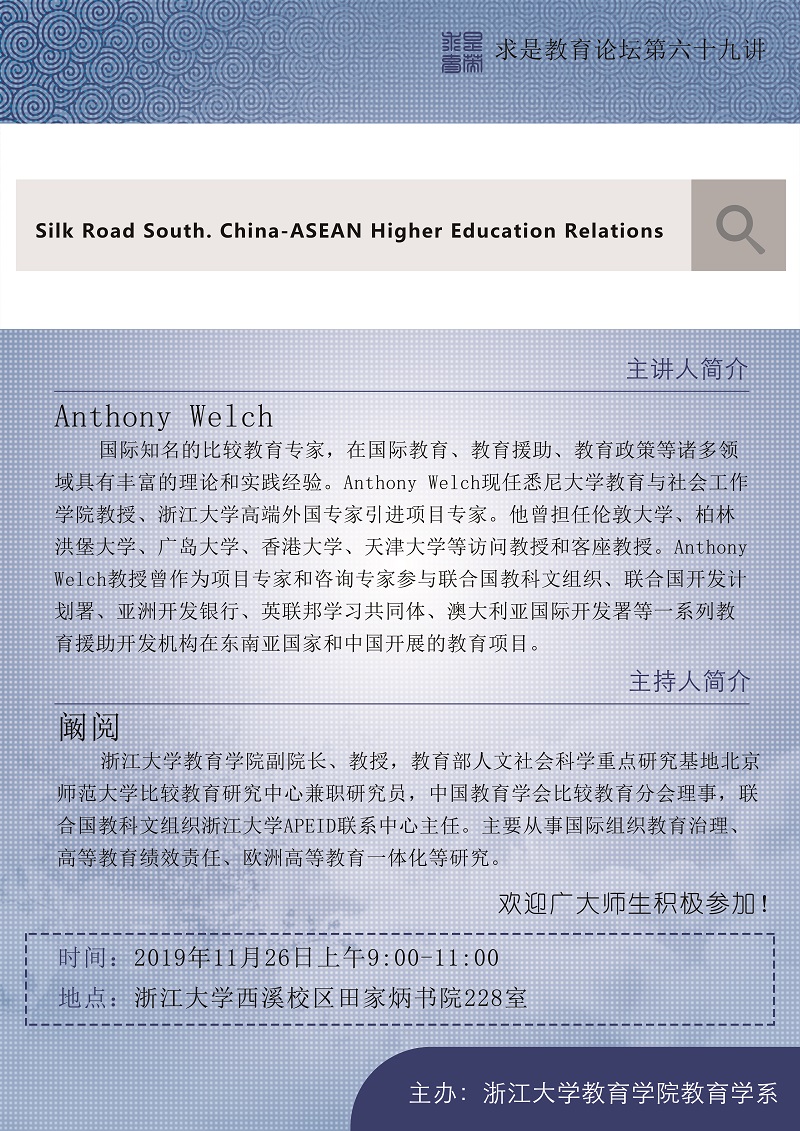 【教育学院】教育学系求是教育论坛第六十九讲:Silk Road South. China-ASEAN Higher Education Relations