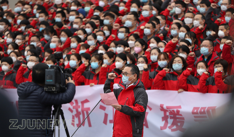 2月14日上午,三支分别来自浙江大学医学院附属第一医院、附属第二医院、附属邵逸夫医院的医疗队在浙江省人民大会堂集结,出征湖北武汉,支援重症及危重症病人救治工作。浙大一院院长黄河、浙大二院常务副院长王伟林、浙大邵逸夫医院下沙院区副院长虞洪分别任医疗队队长。