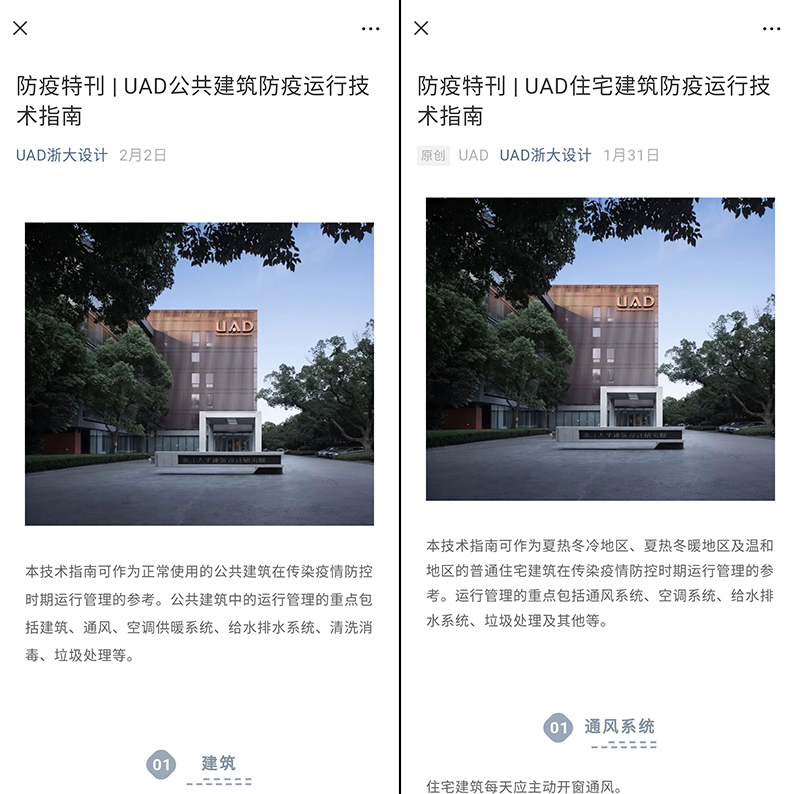 公益工作上,设计院从专业角度出发,通过官方微信公众号(UAD浙大设计)向全社会发布了2则切实可行的防疫运行技术指南:《防疫特刊|UAD住宅建筑防疫运行技术指南》为居家防疫做技术指导,《防疫特刊|UAD公共建筑防疫运行技术指南》为即将复工的各类公共建筑的防疫做技术指导。