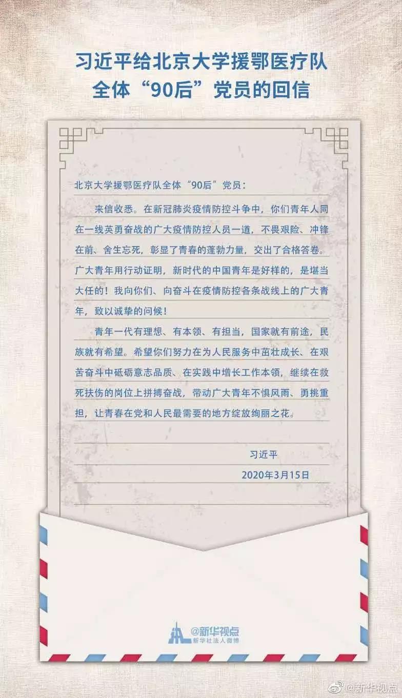 3月15日给北京大学援鄂医疗队全体“90后”党员回信,