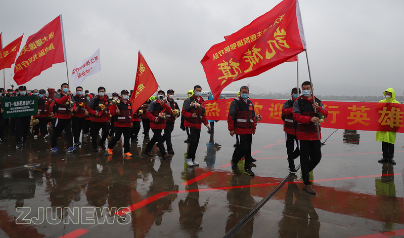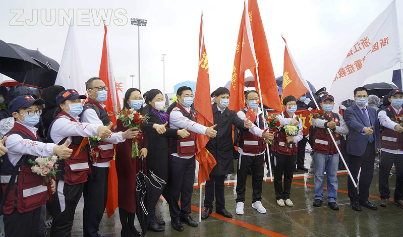 在杭州萧山国际机场,省委常委、省纪委书记、省监委主任许罗德,省人大常委会副主任李学忠,副省长成岳冲,浙江大学党委书记任少波迎接医疗队平安回家。