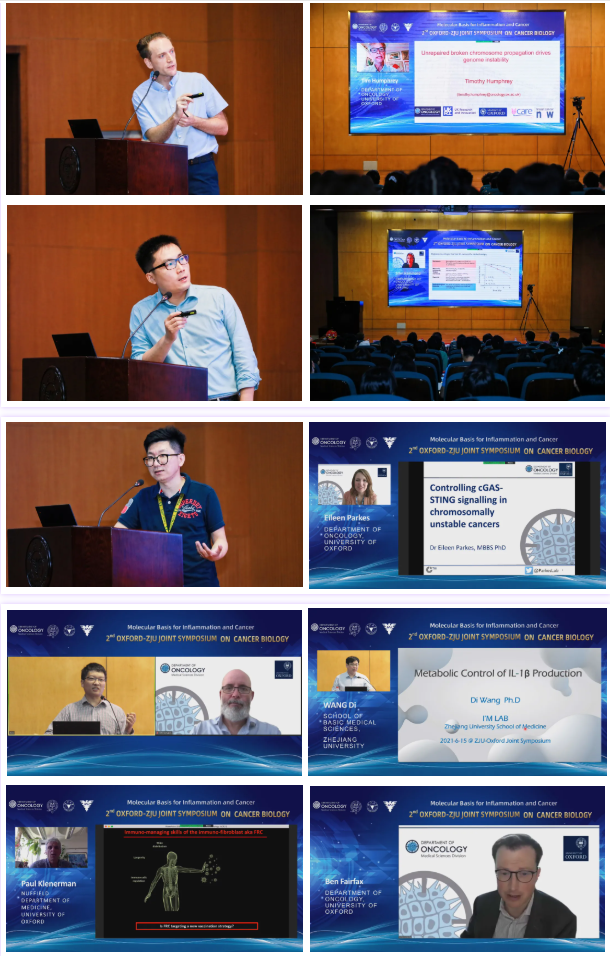 牛津大学肿瘤学系主任Mark Middleton教授和浙江大学基础医学院院长王青青教授致开幕词。Middleton教授回顾了双方合作历史,高度评价了我院在合作中展现的高效和诚意;王青青院长也对牛津合作方在新冠疫情的威胁下,仍然精心组织了本次高水平讲座表达了由衷的感谢。虽然不能在现场面对面,但并不影响双方学者交流的热情,一场以“炎症与肿瘤的分子基础(Molecular Basis for inflammation and Cancer)”为主题的讲座会拉开序幕。会议邀请了牛津大学和浙江大学在肿瘤、炎症与免疫等领域的专家学者,分享最新的前沿研究进展,互动中交流热烈。来自牛津大学的Tim Humphrey, Ester Hammond, Benjamin P Fairfax, Eileen Parkes, Paul Klenerman和浙江大学的Stijn van der Veen,张岩,刘冲,钱鹏旭,王迪等十名学者围绕DNA损伤修复、肿瘤缺氧调控、cGAS-STING信号、抗肿瘤疫苗的T细胞记忆、免疫检查点疗法、抗感染疫苗、造血干细胞自我更新的RNA修饰、脑胶质瘤起源、IL-1β的代谢调控、GPCR的结构与功能等方向展示了最新进展,也为未来的肿瘤个性化精准治疗研究提供了新的见解,互动交流迸发了更多的火花。