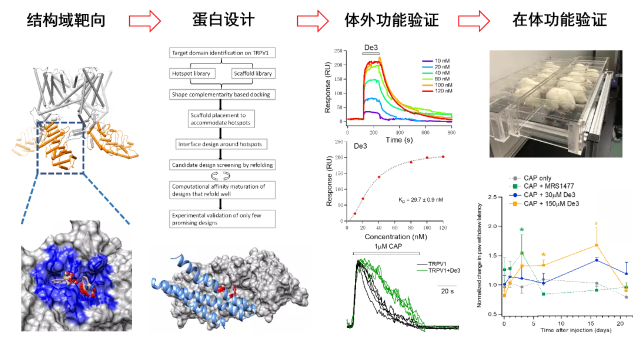 TRPV1是一个钙依赖性脱敏的阳离子通道,而其脱敏与TRPV1胞内的Ankyrin Repeat Domain(ARD,锚蛋白重复序列区)息息相关。作者团队首先以特定结构域(ARD)为靶标,采用“热点中心”策略,计算设计了几十个可能与ARD结合的候选多肽;然后通过Rosetta软件包的从头预测,检查设计多肽是否能如最初设计那样折叠,得到了数个再折叠性能较好的候选多肽。在大肠杆菌中表达这些设计多肽后,作者团队在多层面开展了对设计多肽分子的功能验证:在蛋白层次,采用表面等离子共振技术,验证调控分子与TRP通道上目的结构域的相互作用,并测量亲和力。在细胞层次,通过超分辨率成像、FRET成像技术,验证了调控分子与TRPV1通道的结合,并进一步采用钙成像、膜片钳电生理手段验证设计分子对TRPV1通道功能的正向调控。随后在大鼠热痛模型中进行镇痛活性评价,看到了明显的镇痛效果。