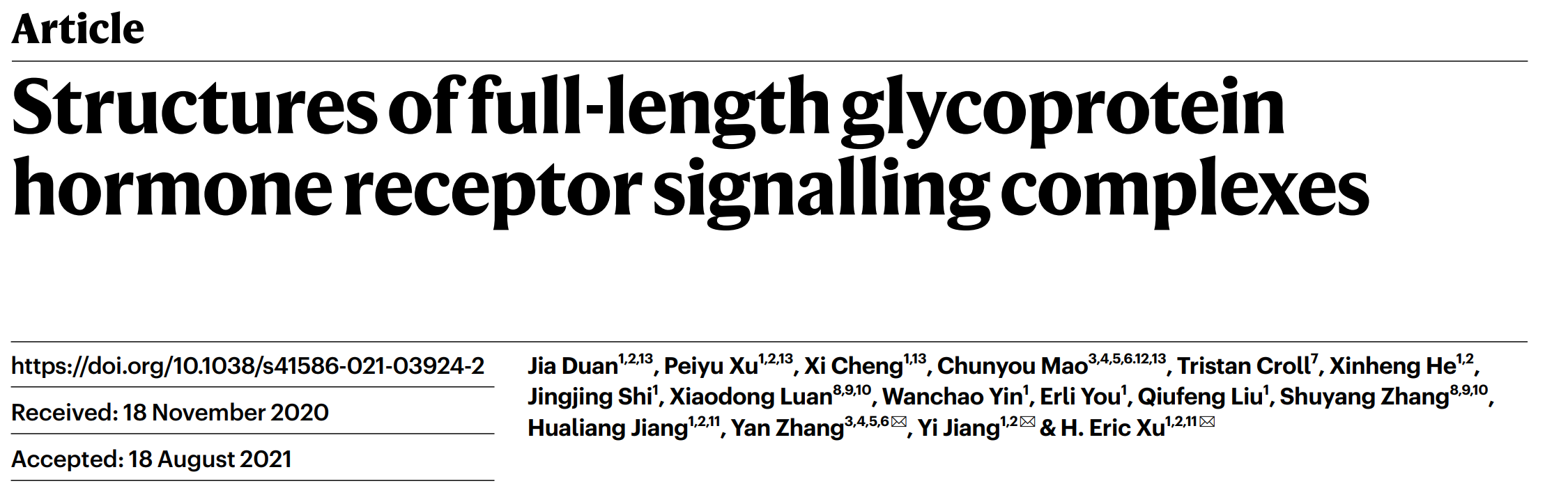 2021年9月22日,浙江大学基础医学院/良渚实验室张岩研究员团队联合中国科学院上海药物研究所徐华强/蒋轶团队,共同在Nature杂志上发表了最新研究成果“Structures of full-length glycoprotein hormone receptor signaling complexes”,首次解析了全长LHCGR处于非激活以及多种激活状态下共四个结构。该工作揭示了CG与LHCGR相互作用的细节模式,阐明了受体从非激活状态到激活状态的构象变化,提出了激素配体激活受体的结构模式图,并进一步揭示了处于1期临床实验的小分子化合物Org43553与受体LHCGR相互作用细节模式,为临床开发替代激素治疗的小分子药物提供结构依据。