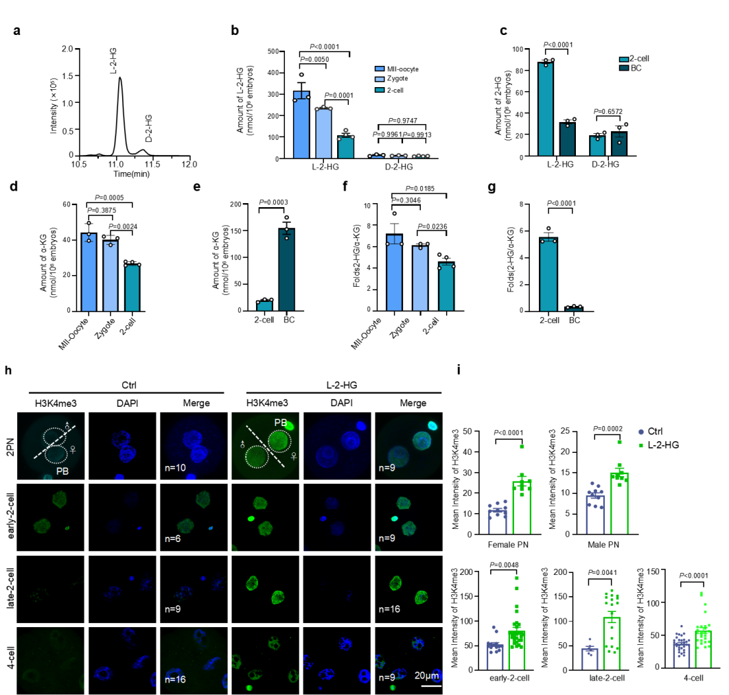 为了进一步研究哺乳动物早期胚胎发育中的2-HG, 研究团队首先鉴定了胚胎中检测到的是通常生理条件下存在的L-2-HG。接着研究团队发现卵母细胞中L-2-HG含量最高,绝对定量显示可以达到mM级别的浓度,这与具有IDH1/2突变的癌症细胞中的D-2-HG的浓度类似。随着受精后胚胎的发育,L-2-HG含量逐渐降低(图4)。早期胚胎体外培养过程中添加外源性L-2-HG会阻碍胚胎的发育。2-HG作为去甲基化酶的辅助因子α-KG的竞争性拮抗剂,可能参与受精后一系列组蛋白的去甲基化过程。研究团队发现如果阻止发育过程中L-2-HG水平的降低,将造成H3K4me3等组蛋白修饰擦除的阻滞。