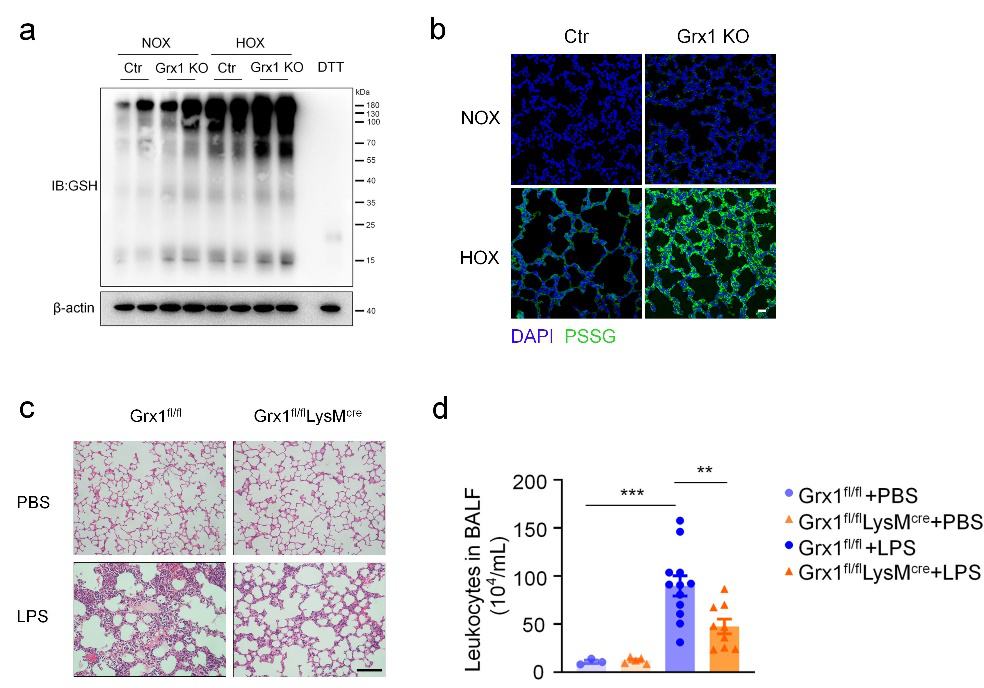该研究作者发现Grx1在急性肺损伤小鼠肺组织中表达量及酶活性显著降低,巨噬细胞中Grx1的缺失及蛋白质的谷胱甘肽化水平的提高可显著缓解急性肺损伤,提示巨噬细胞中蛋白质的谷胱甘肽化在急性肺损伤的疾病进程中发挥了重要功能。