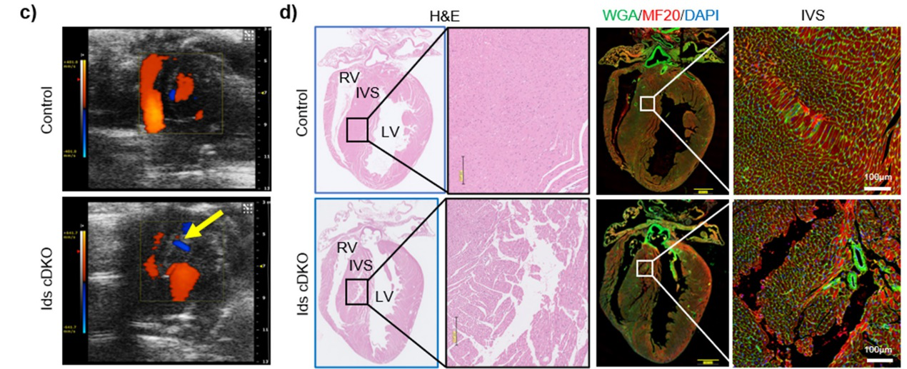 本研究通过将BMPR2突变的CHD-PAH患者的血液重编程获得iPSCs(induced pluripotent stem cells)并进行心肌分化,与对照系相比,BMPR2突变患者的iPSCs的心肌细胞分化效率显著降低,同时Ca离子瞬变能力降低。在BMPR2突变的CHD-PAH iPSCs中,ID1/3的表达水平显著低于对照系。 通过将hESCs(human embryonic stem cells)的ID1与ID3同时进行敲除,中胚层分化研究显示敲除系与对照系相比,其心肌细胞分化效率显著降低,在不同分化阶段其中胚层相关基因的表达水平同样显著低于对照系。 为了深入研究ID1/3调控心肌分化的分子机制,作者将对照系与敲除系细胞进行了单细胞转录组测序。发现ID的敲除促使定向分化在中胚层阶段发生偏移,进一步分析发现特定亚群的丢失,并且该群细胞低表达USP9X基因。接下来在敲除系中通过过表达USP9X部分恢复ID1/3敲除导致的心肌分化缺陷表型。 之前研究结果显示,ID1/3的全部敲除可使得胚胎致死。因此,为了进一步研究ID1/3对于心脏发育以及肺动脉高压的影响,本文建立了MESP1-cre介导的ID1/3条件性敲除鼠。体内实验的结果显示,ID1/3心脏的特异性敲除,致使心脏发育异常,同时导致肺动脉的压力升高。 综上所述,<span color:#f79646;=>本文系统研究了BMPR2下游ID1/3在肺动脉高压发生过程中通过影响心肌细胞发育改变右心功能所起的重要作用,为心肺血管疾病患者的早期基因筛查和对携带突变的患者分型诊治以及BMPR2靶向药物开发提供依据。 图3 多普勒超声和免疫组化及荧光共聚焦影像分析显示Id1/3三敲鼠存在室间隔缺陷 本文的通讯作者是杨隽研究员,第一作者为杜明霞,同时姜海滨,刘洪宪,李亚宁,周腾飞等提供了重要的帮助。本文也得到北京安贞医院顾虹教授和剑桥大学Morrell教授等的支持与帮助。该研究项目得到了国家科技部“干细胞研究与转化”重点研发项目的支持。