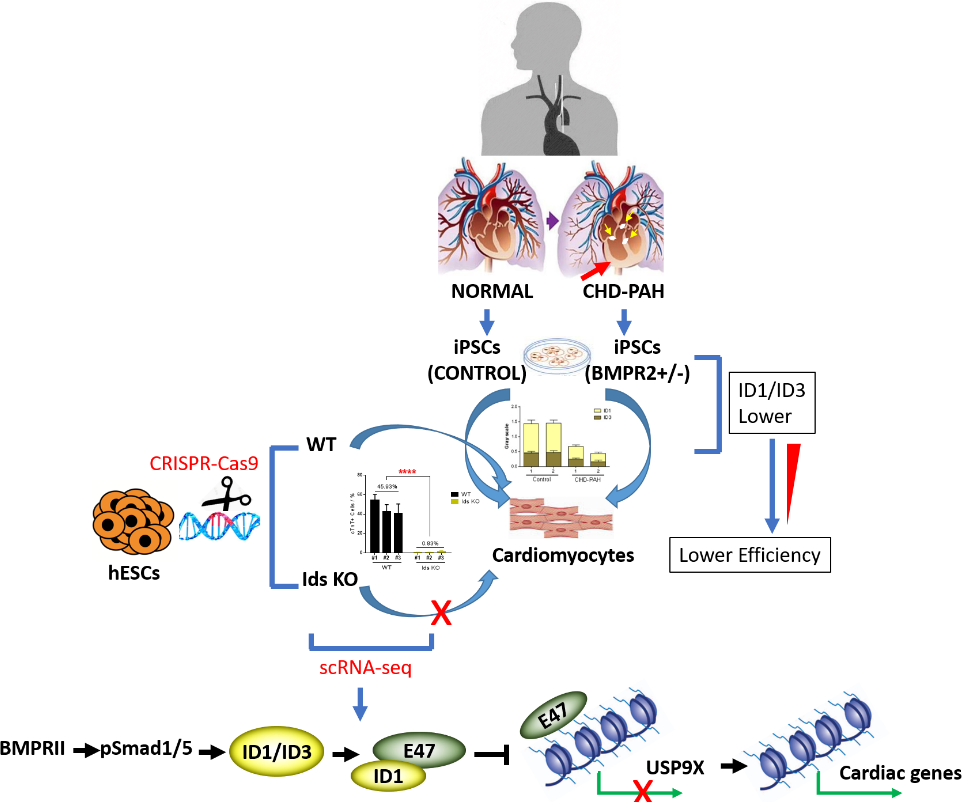 该研究通过先天性心脏病患者的诱导多能干细胞结合单细胞测序及对应的心肌细胞敲除动物模型揭示了BMP下游ID基因在调控心肌细胞分化以及CHD-PAH(Congenital heart disease-Pulmonary arterial hypertension,先心相关肺动脉高压)患者右心功能中的作用机制。