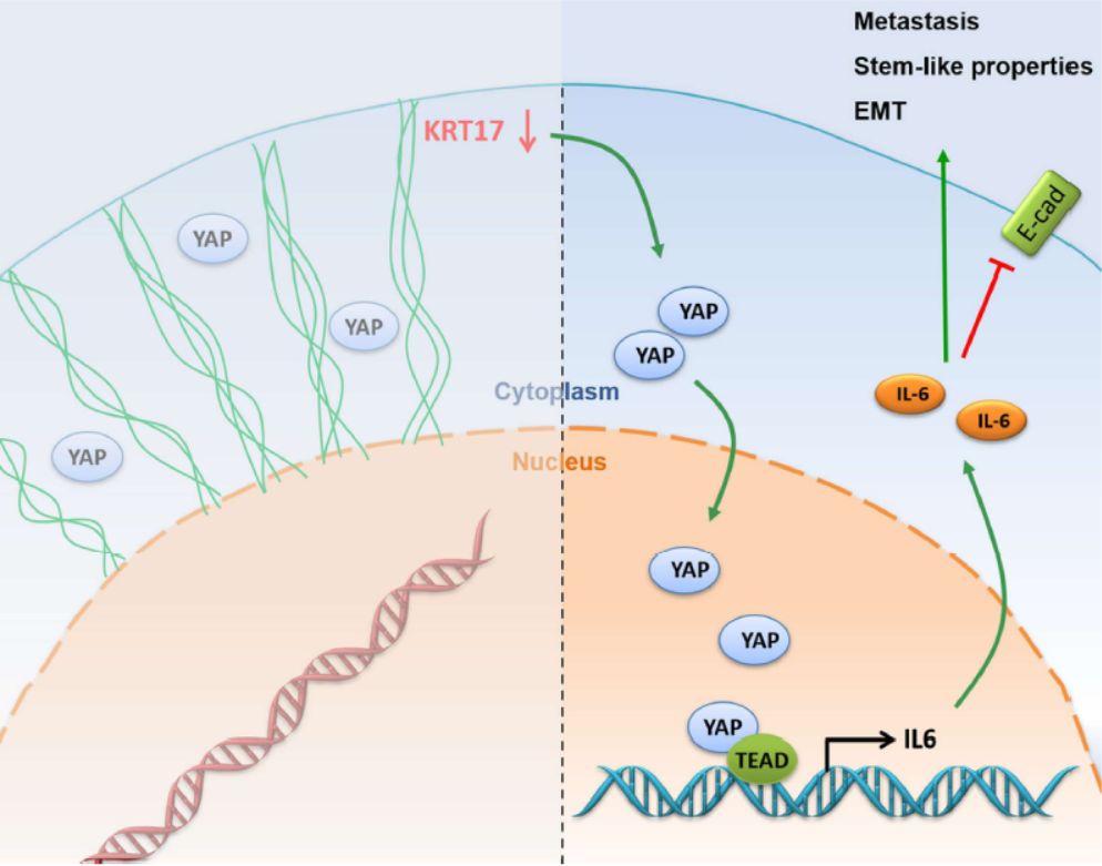 进一步研究发现,弥散型胃癌细胞中间纤维KRT17的丢失会导致细胞骨架重构,应力纤维增加,RHOA活性增强,进而激活YAP信号,YAP通路靶基因如IL-6表达上升激活了EMT重要的转录因子,下调CDH1表达水平,从而维持弥散型胃癌细胞的特殊分子特征和恶性表型。