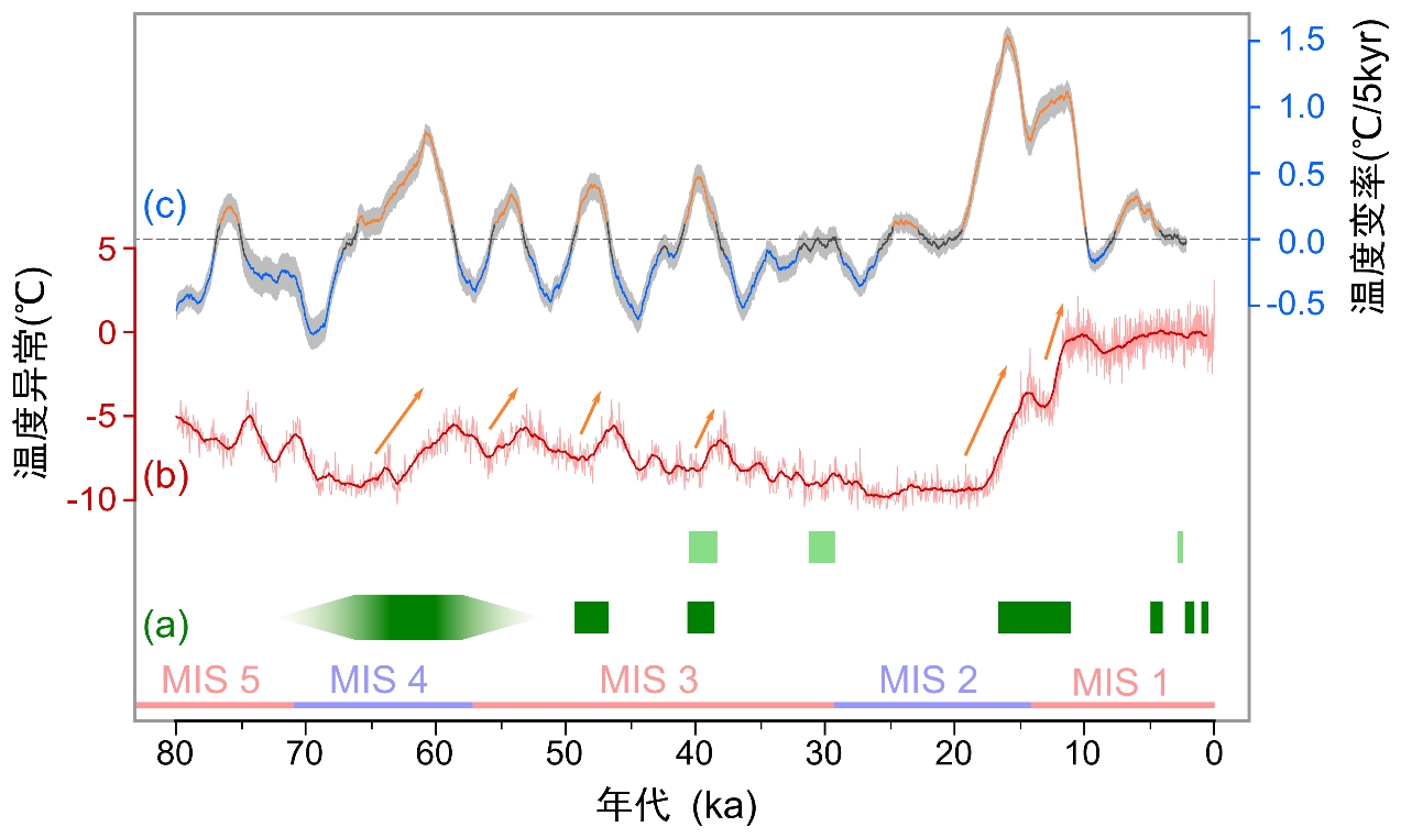 该项目重建的塔克拉玛干沙漠近8万年以来的湿润地质记录(绿色)及其与南极气温异常的对比