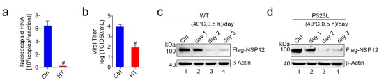 图2.热激对病毒RNA的转录及滴度的影响;连续热激对NSP12及其L323P突变体的降解作用