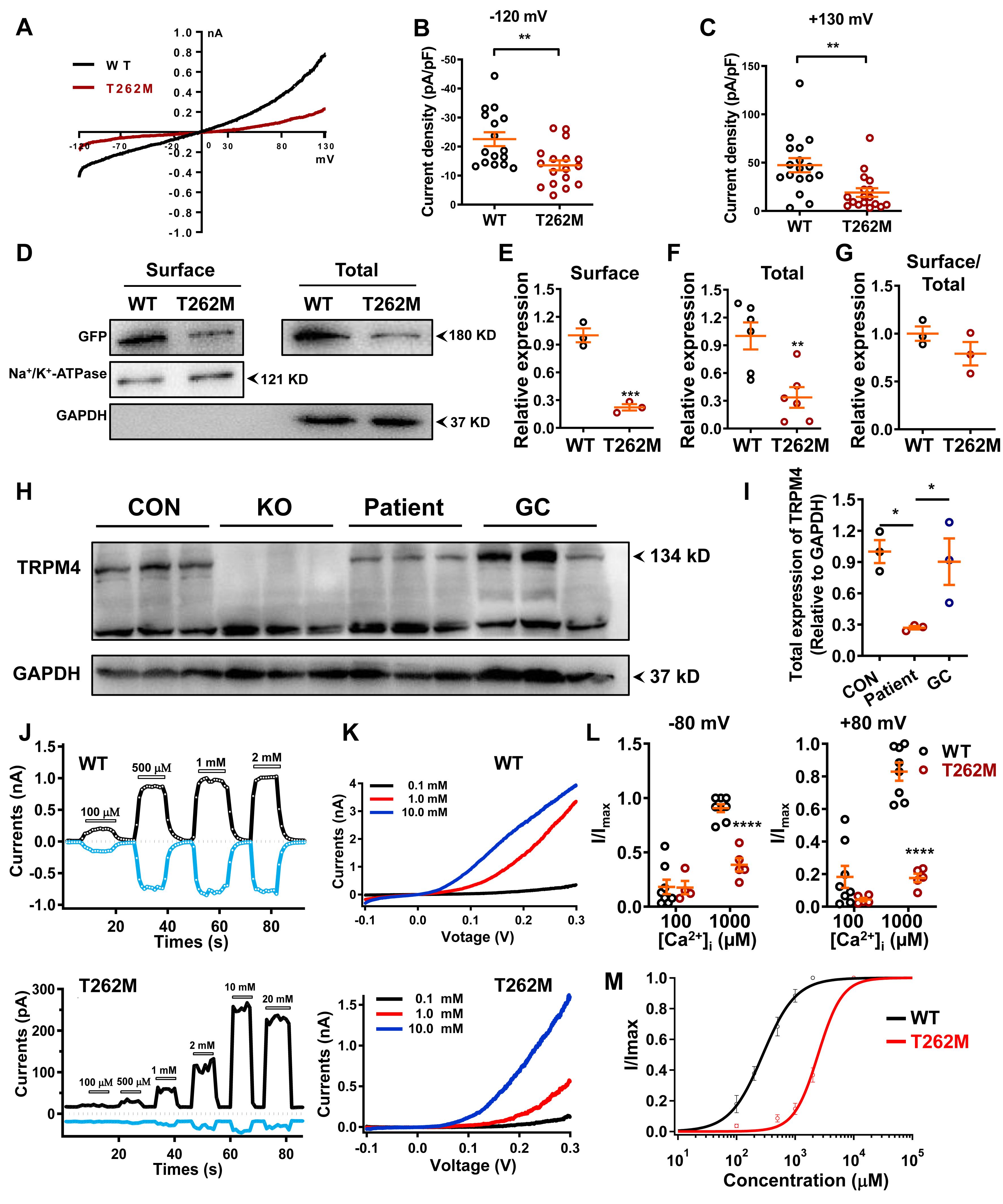 接下来,研究者对受累基因TRPM4进行了系统性的功能研究。在HEK293T细胞中分别过表达野生型(WT)和T262M突变型TRPM4通道,并通过全细胞(whole-cell)膜片钳和生物素标记的膜蛋白表达实验发现:T262M组TRPM4电流密度显著减小,TRPM4总蛋白和膜蛋白均显著减低,但膜蛋白与总蛋白的比例(膜蛋白/总蛋白)保持不变。在iPSC-CM模型中进行内源性TRPM4通道的蛋白表达检测发现:患者组心肌细胞的TRPM4蛋白表达显著低于正常人组和矫正组心肌细胞,而敲除组心肌细胞中几乎没有TRPM4通道表达。此外,研究者应用内膜向外式(inside-out)膜片钳记录发现了T262M引起TRPM4通道对钙离子的敏感性显著减低。以上结果提示了T262M突变导致了TRPM4通道的功能受损。