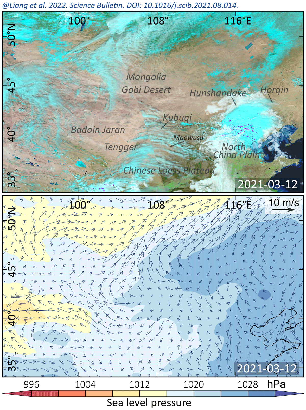 这项综合研究成果,不久前在知名期刊Science Bulletin(《科学通报》)上发表,团队首次从科学角度全面系统阐明了2021年春季我国特大沙尘暴期间的粉尘释放、传输及物质交换过程。课题组博士后梁鹏为论文第一作者,杨小平教授为通讯作者,多位研究生参与其中。