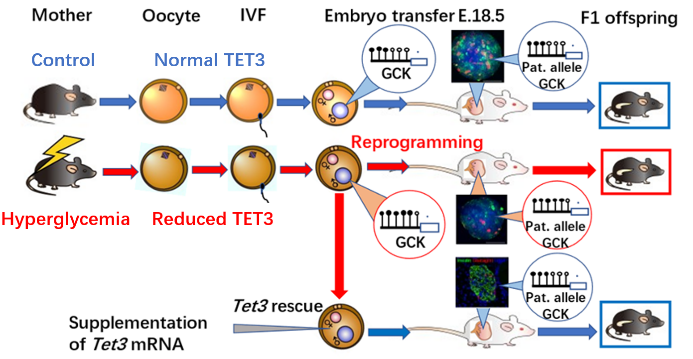 两个团队合作证实,由于糖尿病雌鼠体内的高糖环境,让卵母细胞中具有重编程DNA甲基化谱式功能的TET3蛋白剂量不足,进而使得TET3在受精后进入雄原核中推动重编程的潜能不足,导致“去甲基化不足”或 “高甲基化”。“这就好比原来有十个农民耕地(TET3介导氧化去甲基化),现在少了一部分人(TET3不足),很多地就没有开垦完全(DNA甲基化重编程未完全),影响未来的收成(子代健康受到影响)”。