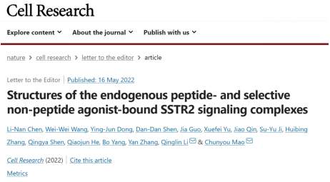 2022年5月17日,浙江大学医学院附属邵逸夫医院毛春友研究员联合中国科学院大学附属肿瘤医院李清林教授在Cell Research上在线发表了题为“Structures of the endogenous peptide and selective non-peptide agonist-bound SSTR2 signaling complexes”的研究论文。本研究利用单颗粒冷冻电镜技术分别解析了SSTR2与内源性多肽激动剂(SS-14)和选择性小分子激动剂(L-054,264)复合物的高分辨电镜结构。结合细胞功能检测技术,本研究阐明了SSTR2多肽和小分子配体的识别模式,揭示了选择性小分子配体的受体选择性机制。